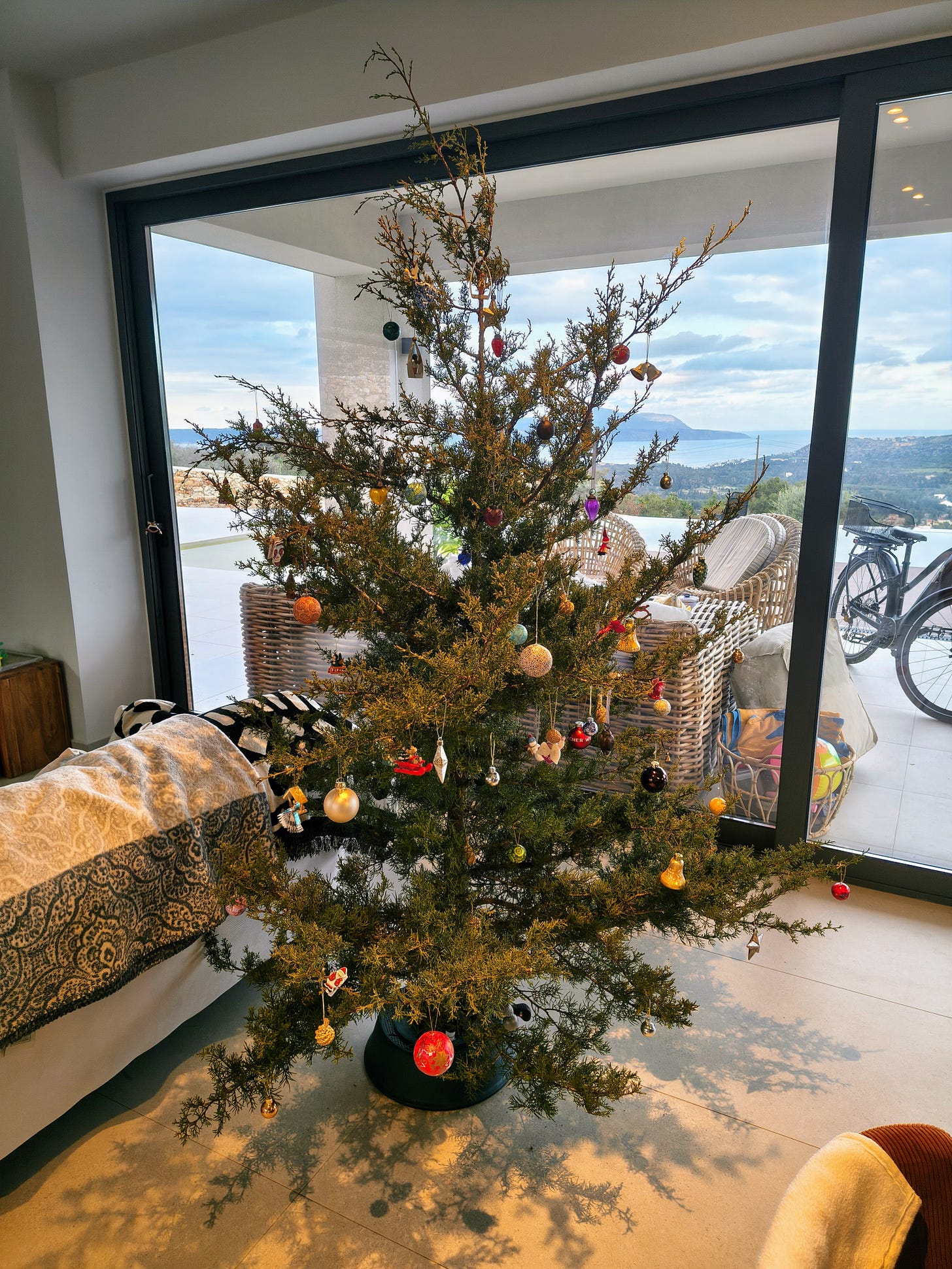 Zum ersten Mal steht auf dieser Reise ein Weihnachtsbaum bei uns. Eine Zypresse aus den Weißen Bergen. Den Ständer haben wir uns vor Kurzem zugelegt. Die Lichter fehlen noch. Heute Abend kommen ein paar Geschenke darunter.