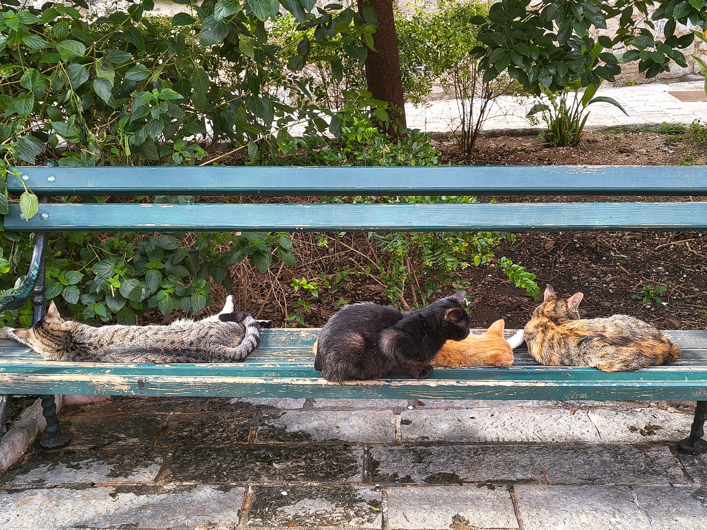 Eine von ihnen, eine kleine getigerte Katze, erinnert uns an unsere Lisbeth. Sie ist zutraulich, wartet immer vorm Hoteleingang und schnurrt um unsere Beine. Die ersten Tage füttere ich sie noch draußen, aber am letzten Abend nehmen wir sie kurzerhand mit ins Apartment und kuscheln mit ihr, bis sie sich zusammengerollt und sichtlich glücklich auf unserem Bett in den Schlaf schnurrt.
