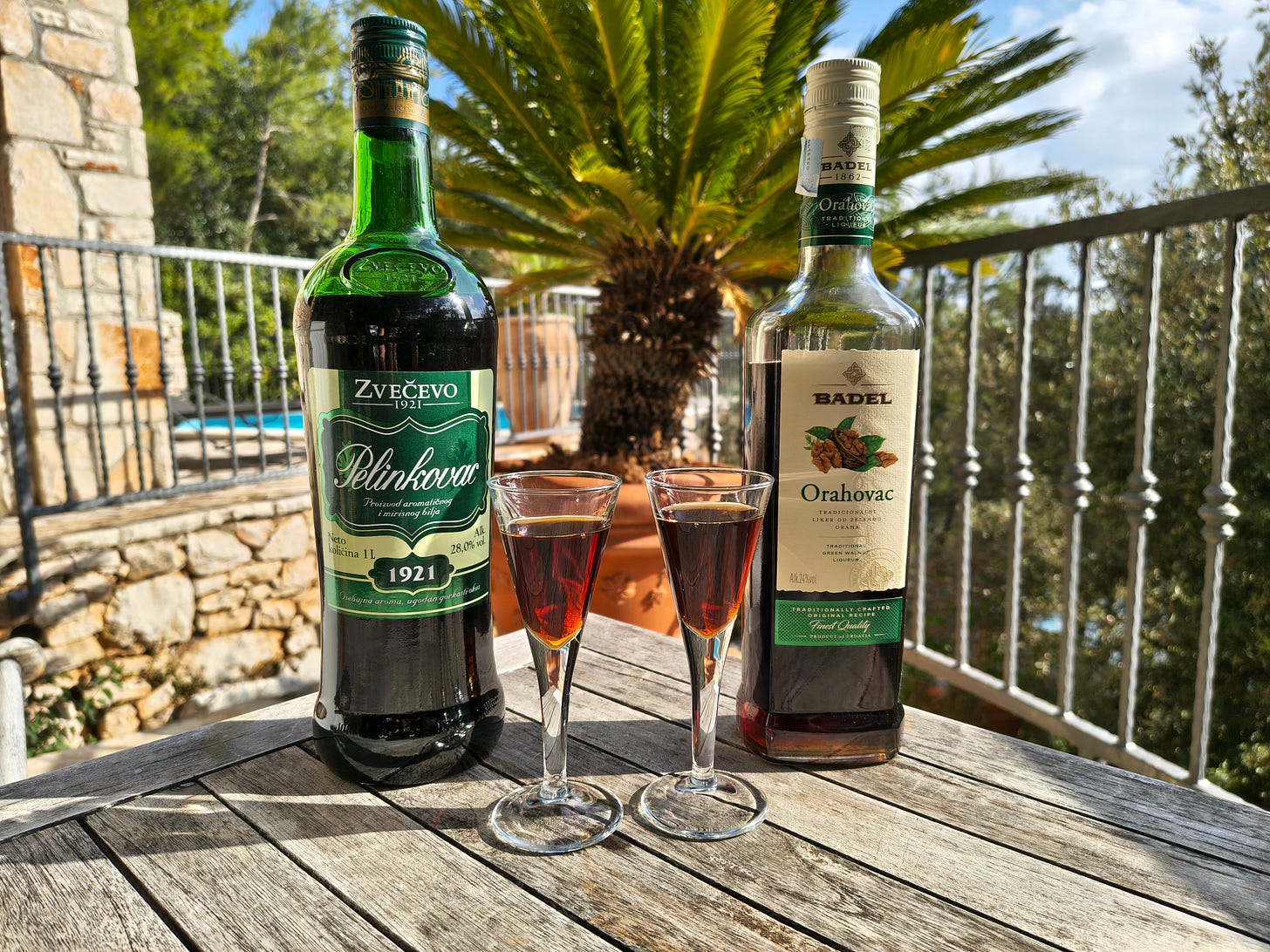 Abends, wenn die Luft langsam abkühlt und sich der Tag in warmem Licht auflöst, sitzen wir - wie heute - auf einer kleinen Terrasse mit Blick aufs Meer. Ein schlichter Tisch. Zwei Gläser. Abendlicht. Dunkelbraun der eine, fast schwarz der andere: Pelinkovac und Orahovac – zwei Schnäpse, die man hier auf Hvar überall bekommt.